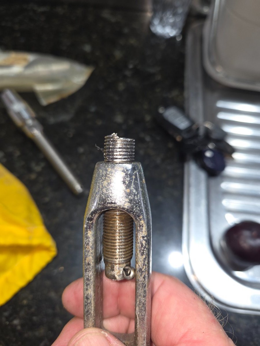 Island Time 1,345 Posted January 8 Author Share Posted January 8 Dual toggle at base of forestay pin at base, T connector above it. No sign of bending, thread is dead straight. The break is spotlessly clean and shows no corrosion. Yes there is a small tear on one side, maybe 1-2mm of ripped thread. This fitting, for some stupid reason was 1/2 inch, but all the other stays are 5/8. New forestay on today, all 5/8, and 10mm wire (up from 8). Last time the rigging was replaced I just asked the rigger to duplicate it. I should have looked closer! 1 1 Quote Link to post Share on other sites